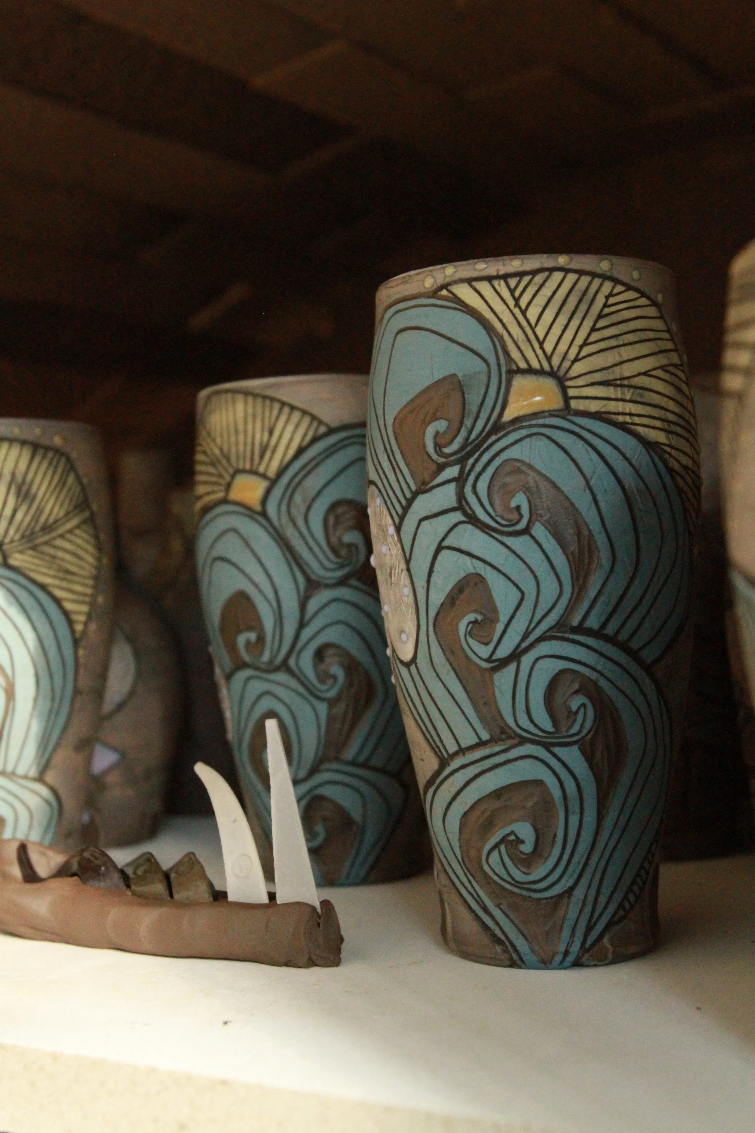 At clay’s most pliable stage, I mold it into the desired shape, leaving proof of its malleability with the gentle imprint of a textured stamp. When the clay is firm enough to hold shape, I carve a topography of imagery onto its walls. Removing clay with metal tools, I create motifs inspired by the California landscape, folk art, and my imagination. I fire in gas reduction, where the smoke trapped in the kiln during the firing interacts with the pot’s surface, producing a marbled finish.